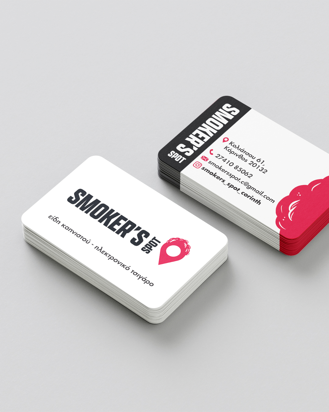 Το Smoker's Spot είναι κατάστημα ηλεκτρονικού τσιγάρου και ειδών καπνίσματος, το οποίο ξεκίνησε την λειτουργία του τον Μάιο του 2025 και βρίσκεται στην Κόρινθο. Η ιδέα για την δημιουργία του λογοτύπου ξεκίνησε από το όνομα, το οποίο βοήθησε κατά πολύ στο τελικό αποτέλεσμα. Συνδυάσαμε το icon της τοποθεσίας (spot) με τους ατμούς/καπνούς που παράγουν τα είδη καπνίσματος και ατμίσματος. Τα χρώματα περιορίστηκαν μόνο σε 2, το μαύρο και το κόκκινο, τα οποία αναδεικνύουν την συνολική εικόνα του καταστήματος, μιας και όλος ο χώρος είναι βαμμένος σε off white. Επίσης μετά από μελέτη που έγινε και στον εξωτερικό χώρο παρατηρήσαμε ότι όλα τα γειτονικά καταστήματα έχουν πολλά σκούρα χρώματα οπότε κινούμενοι σε αντίθετη κατεύθυνση, καταφέραμε να αναδείξουμε επιτυχημένα το κατάστημα.